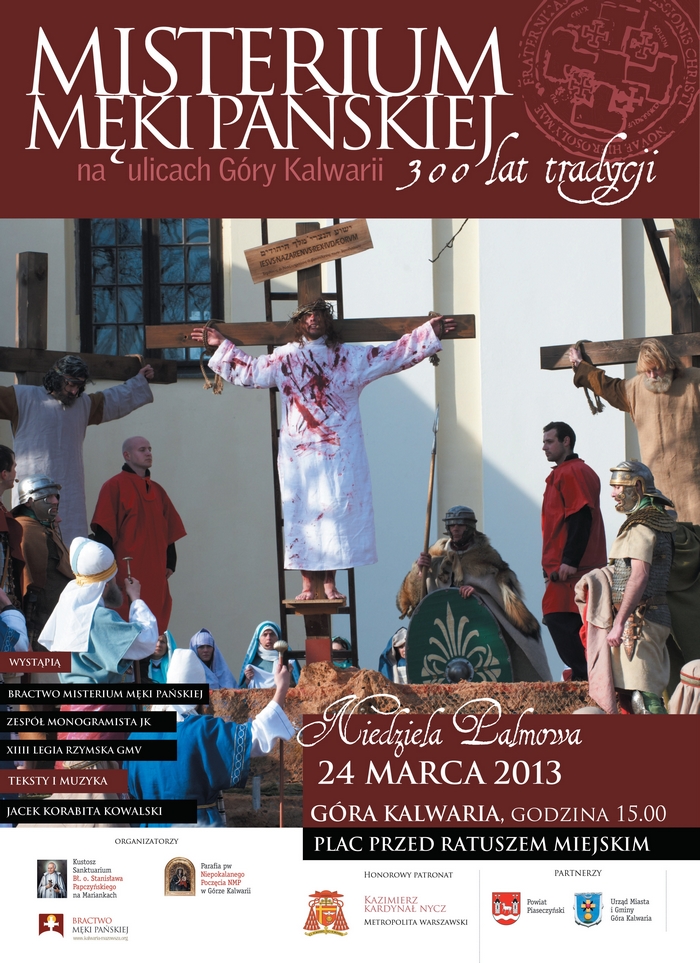 W roku 2013 kontynuowana jest tradycja misteriów pasyjnych w Górze Kalwarii i przygotowane jest wystawienie kolejnego Misterium. Odbędzie się ono tradycyjnie w Niedzielę Palmową 24 marca 2013 roku o godz. 15 na placu przed Ratuszem. Serdecznie zapraszamy do wizyty w trakcie próby generalnej (23 marca) oraz w czasie samego Misterium. kalwaria-mazowsza.org