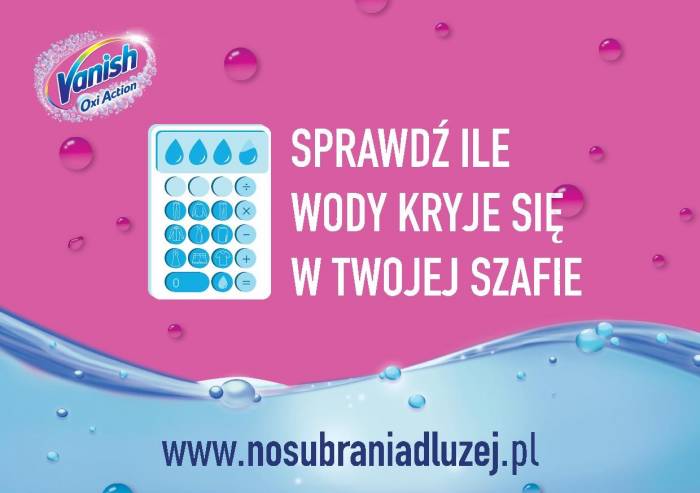 Dużą rolę w temacie troski o planetę odgrywają codzienne, zwykłe wybory dotyczące zakupów ubrań, ich pielęgnacji czy wreszcie „długości ich życia”. Okazuje się bowiem, że niewiele z nas zdaje sobie sprawę ile wody kryją w sobie ubrania, które zalegają w naszych szafach. Wystarczy sięgnąć do kalkulatora śladu wodnego www.vanish.pl/nosubraniadluzej, aby przekonać się, że do produkcji 1 t-shirtu potrzeba ok. 2 500 litrów, a para jeansów to już znacznie ok. 6 727 litrów. Jest zatem oczywiste, że w każdej szafie kryją się tysiące litrów wody, której nie dostrzegamy oddając się szaleństwu zakupów.