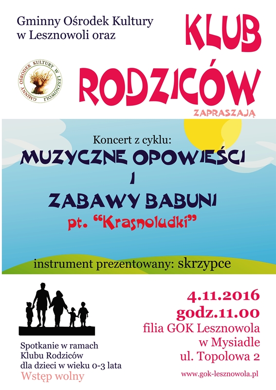 4.11.2016 r. godz. 11.00 odbędzie się koncert dla maluszków "Muzyczne opowieści i zabawy babuni" pt. "Krasnoludki" w Klubie Rodziców. Miejsce: filia GOK Lesznowola w Mysiadle, ul. Topolowa 2. Zapraszamy do Klubu Rodziców w filii GOK Lesznowola w Mysiadle.