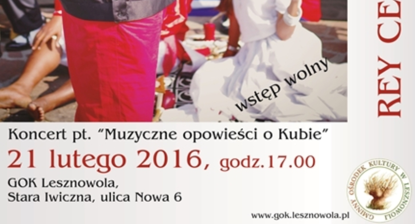 21.02.2016 r. o godz. 17.00 zapraszamy na gorący koncert pt. "Muzyczne opowieści o Kubie" w wykonaniu Reya Ceballo i Tradicuba. Miejsce: GOK Lesznowola w Starej Iwicznej, ul. Nowa 6.