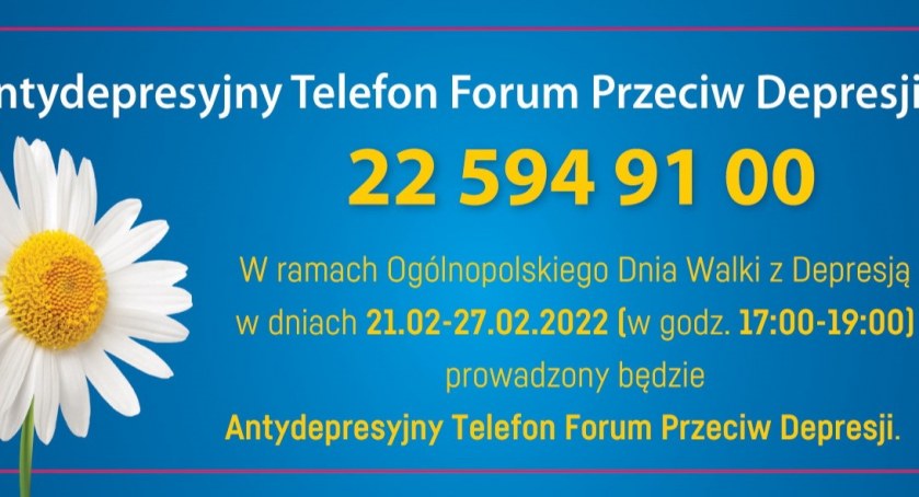 W ramach Ogólnopolskiego Dnia Walki z Depresją w dniach 21.02-27.02.2022 (w godzinach 17:00-19:00) prowadzony będzie Antydepresyjny Telefon Forum Przeciw Depresji.