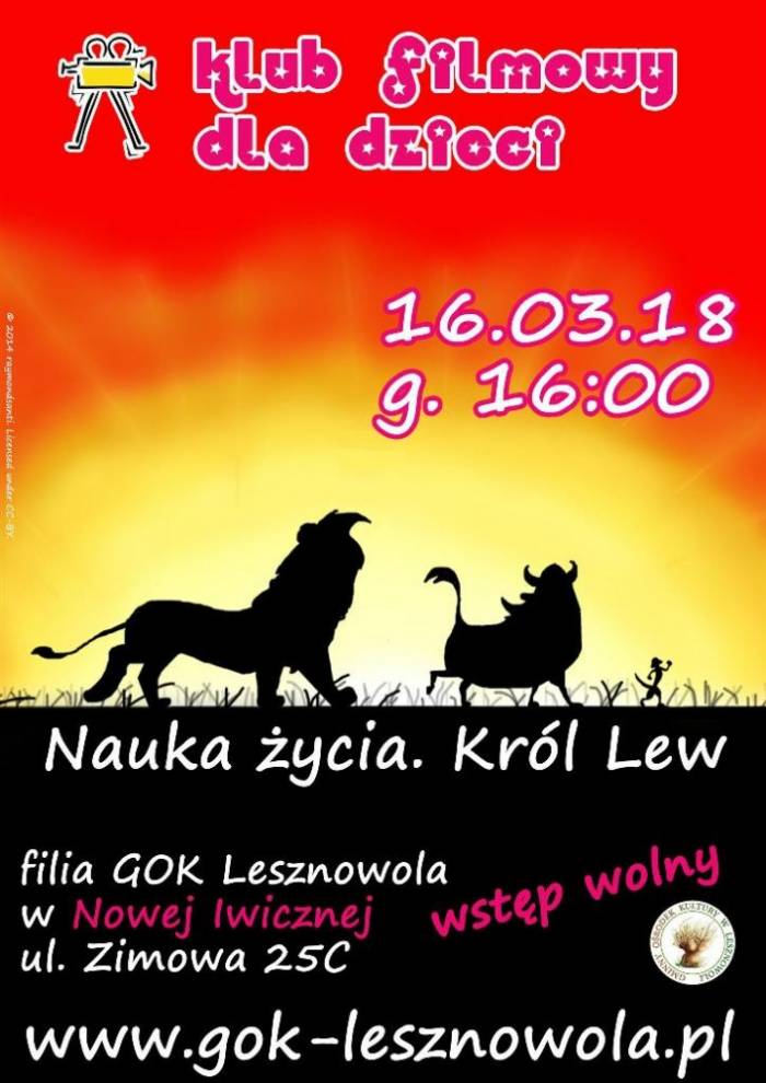 16.03.2018 r. godz. 16.00 - Klub Filmowy dla dzieci. Nauka życia "Król Lew". Miejsce: filia GOK Lesznowola w Nowej Iwicznej, ul. Zimowa 25 c.