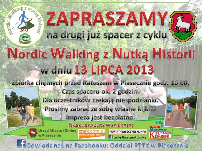 13 lipca 2013 roku zapraszamy na drugą imprezę z cyklu Nordic Walking z nutką historii. Zbiórka o godz. 10.00 przed Ratuszem w Piasecznie. Spacer potrwa ok. 2 godziny. Udział w nim jest bezpłatny. Zapraszamy!