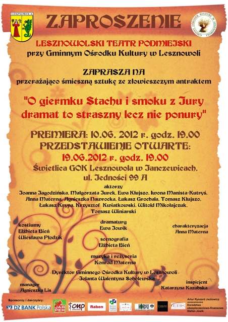 19 czerwca 20012 roku zapraszamy na sztukę ze złowieszczym antraktem pt. O GIERMKU STACHU I SMOKU Z JURY DRAMAT TO STRASZNY LECZ NIE PONURY autorstwa Ewy Jowik w reż. Konrada Materny i w wykonaniu Lesznowolskiego Teatru Podmiejskiego przy GOK Lesznowola! Miejsce: Scena Lesznowolskiego Teatru Podmiejskiego: świetlica GOK Lesznowola w Janczewicach, ul. Jedności 99 a. Wstęp wolny. Zapraszamy na spektakl.