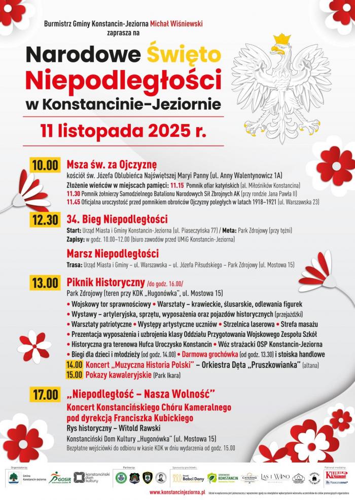 Parada z biało-czerwoną flagą, bieg uliczny, pokazy sprzętu wojskowego i pojazdów historycznych, warsztaty patriotyczne oraz koncerty – tak gmina Konstancin-Jeziorna zaprasza do wspólnego świętowania 11 listopada. Będzie radośnie, rodzinnie i z mnóstwem atrakcji.