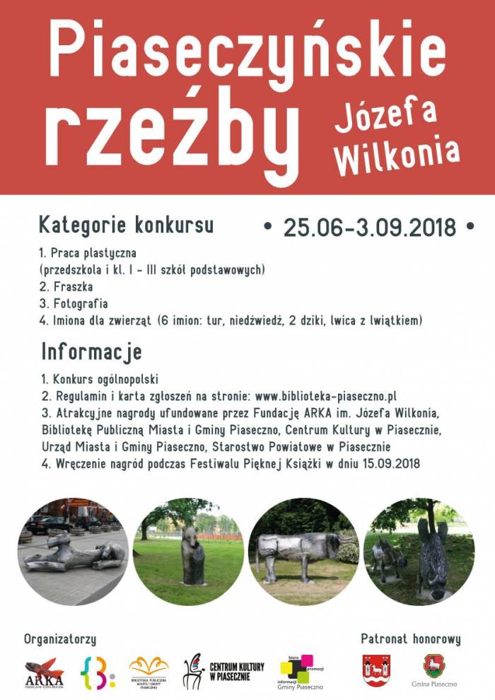 Fundacja ARKA im. Józefa Wilkonia, Biblioteka Publiczna Miasta i Gminy Piaseczno, Centrum Kultury w Piasecznie oraz Biuro Promocji Urzędu Miasta i Gminy Piaseczno ogłaszają ogólnopolski konkurs „Piaseczyńskie rzeźby Józefa Wilkonia”. Termin składania prac 25.06-3.09.2018.