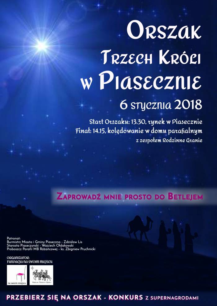 Już po raz trzeci ulicami Piaseczna przejdzie Orszak Trzech Króli. Wydarzenie będzie miało miejsce 6 stycznia 2018 r., w Uroczystość Objawienia Pańskiego.