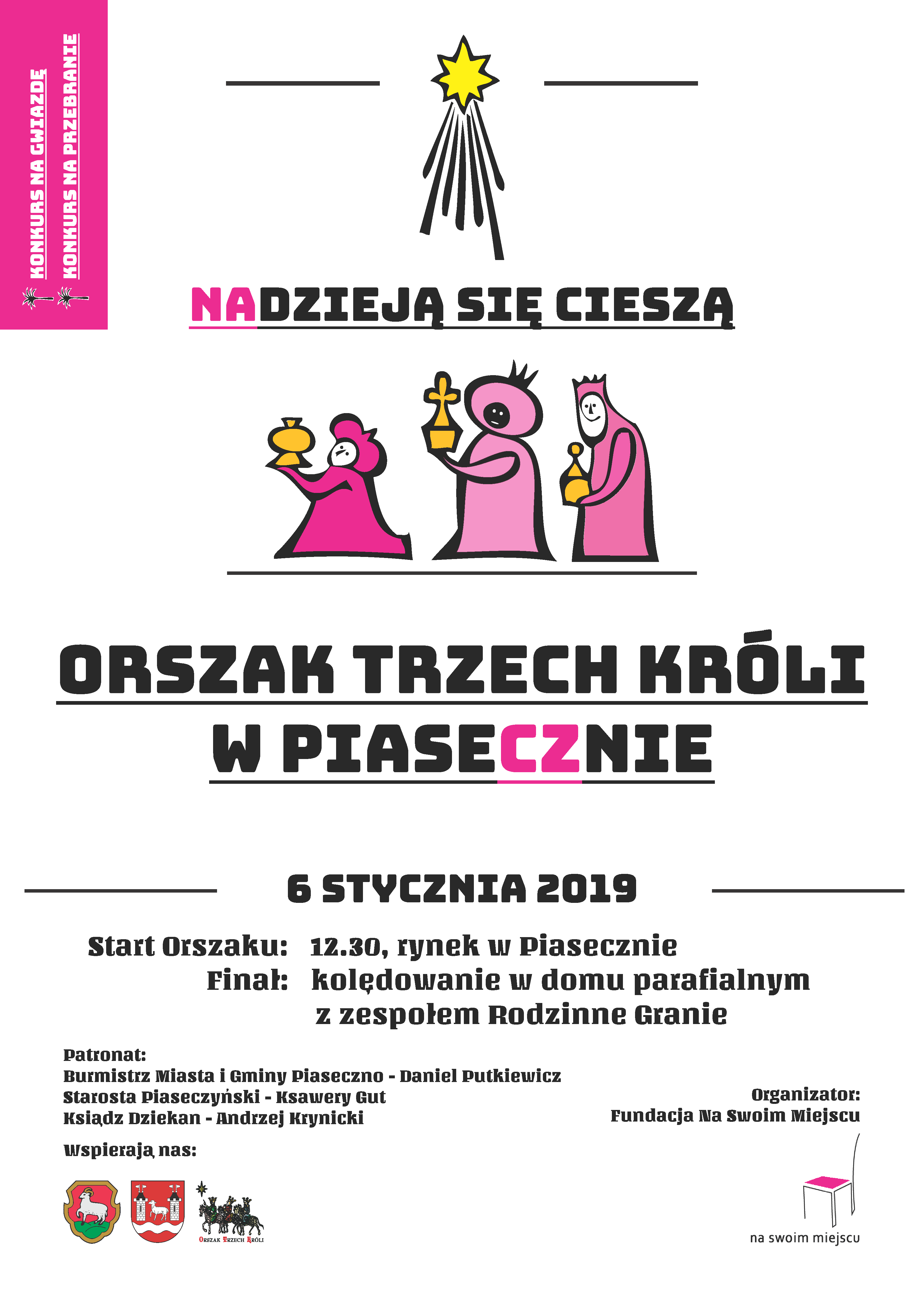 6 stycznia 2019 roku w godz. 12:30 – 14:30 zapraszamy na Orszak Trzech Króli i wspólne kolędowanie w Piasecznie. Start Orszaku: 12:30 na piaseczyńskim rynku (plac Piłsudskiego). Finał: 13:15 – kolędowanie z zespołem Rodzinne Granie w Auli Niebieskiej domu parafialnego.