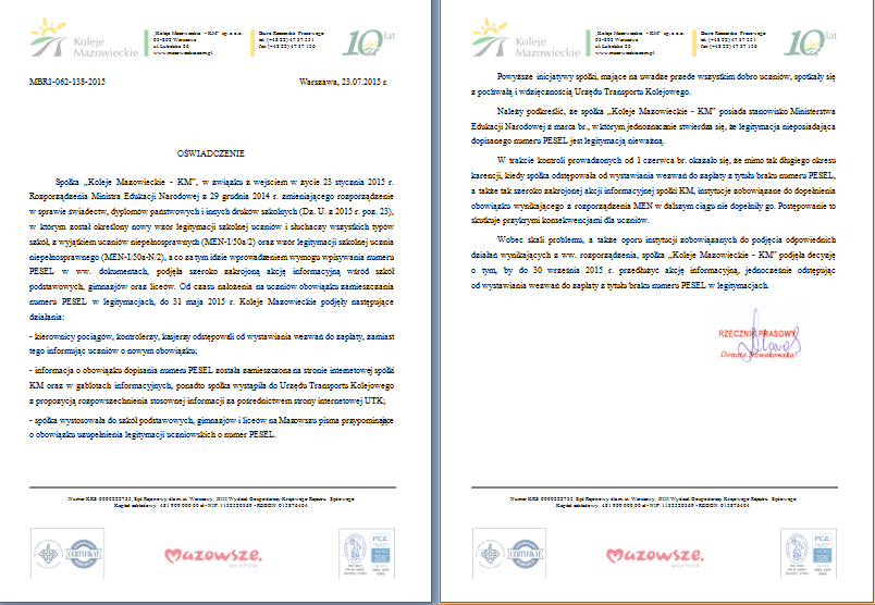 Należy podkreślić, że spółka „Koleje Mazowieckie - KM” posiada stanowisko Ministerstwa Edukacji Narodowej z marca br., w którym jednoznacznie stwierdza się, że legitymacja nieposiadająca dopisanego numeru PESEL jest legitymacją nieważną.
