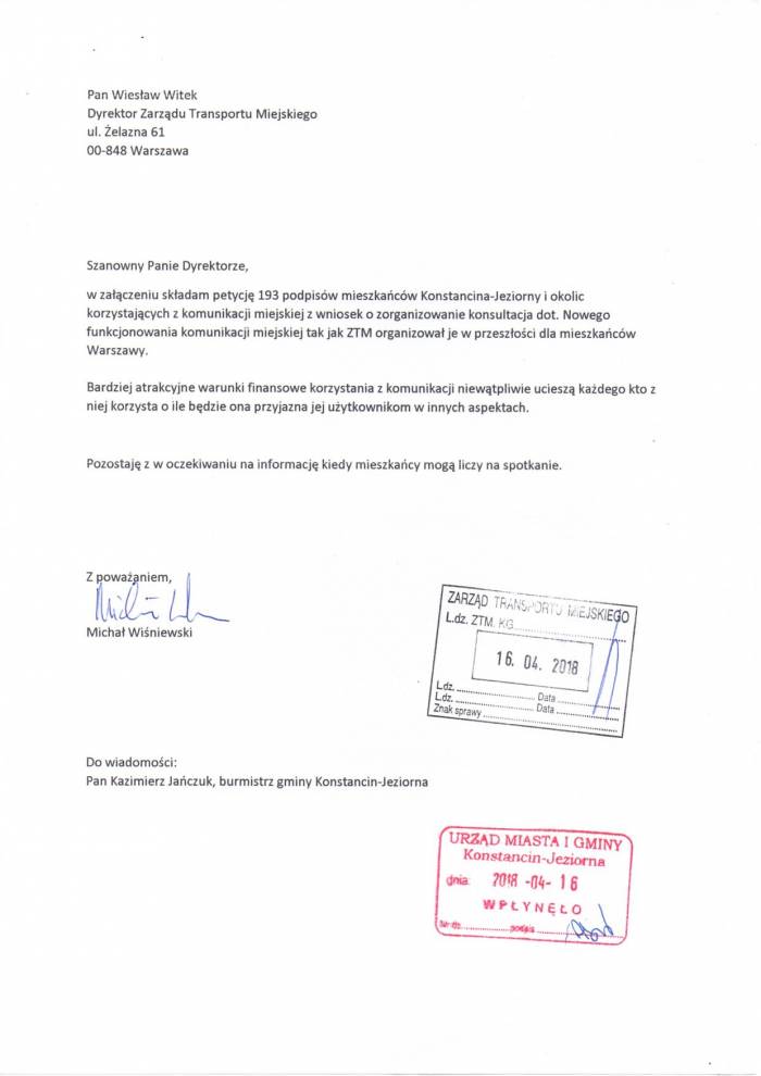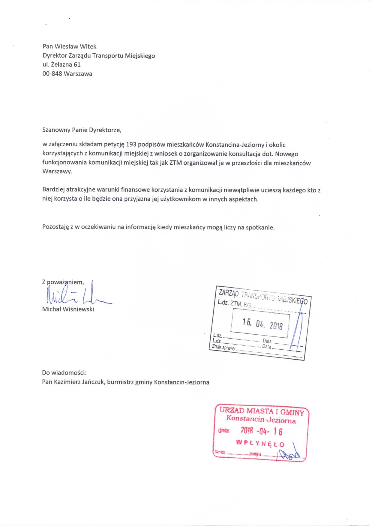 Szanowni Państwu, do wczoraj potrzebę konsultacji funkcjonowania komunikacji miejskiej poprało 193 mieszkańców. Dziś dokumenty zostały złożone zarówno w kancelarii ZTM, jak i gminy Konstancin-Jeziorna (skan w załączeniu). Wierzę, że będzie można stworzyć wygodne połączenie autobusowe z Warszawą, szczególnie, że w niedalekich Markach udało się tak skontrować rozkłady jazdy, że o niektórych porach autobusy będą kursować co 5 min. http://www.ztm.waw.pl/aktualnosci.php?i=2124&c=100&l=1 Mam nadzieję, że i u nas będzie można wypracować dobre dla mieszkańców rozwiązania.