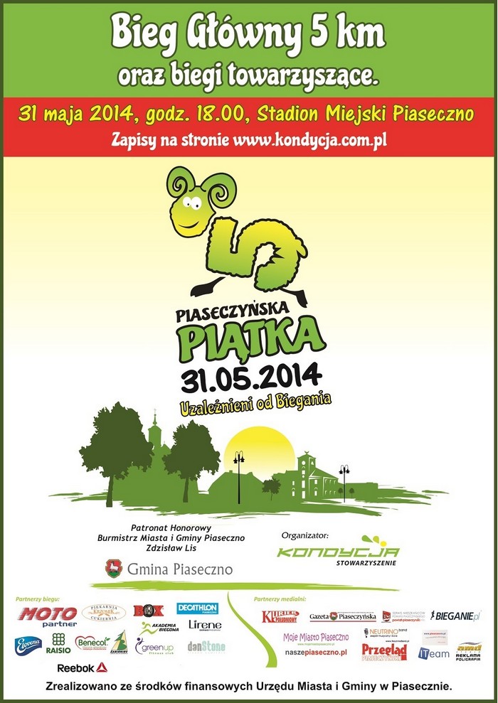 31 maja 2014 roku zapraszamy na II edycję biegu Piaseczyńska Piątka. Hasłem tegorocznej imprezy jest Uzależnieni od Biegania . Wszystkich sympatyków lekkiej atletyki zapraszamy do zapisów, poprzez stronę www.kondycja.com.pl