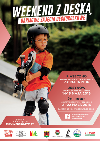 7-8 maja 2016 r. w godz. 10.00 - 18.00 odbędzie się Piaseczyński Weekend Deskorolkowy. Zapraszamy dzieci w wieku od 6 lat na darmowe zajęcia deskorolki, które odbędą się na skateparku w Piasecznie przy ulicy Okulickiego 19.