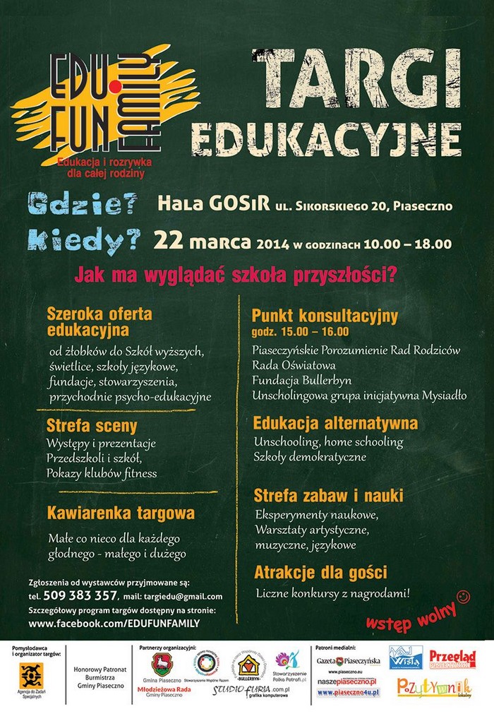 22 marca 2014 roku zapraszamy do uczestnictwa w drugiej edycji Targów Edukacyjnych EDU FUN FAMILY organizowanych w Piasecznie. Miejsce: Hala GOSiR Piaseczno, ul. Sikorskiego 20. Celem targów będzie przedstawienie całościowej oferty edukacyjnej na naszym terenie - od żłobków do szkół wyższych. Wstęp dla gości wolny.