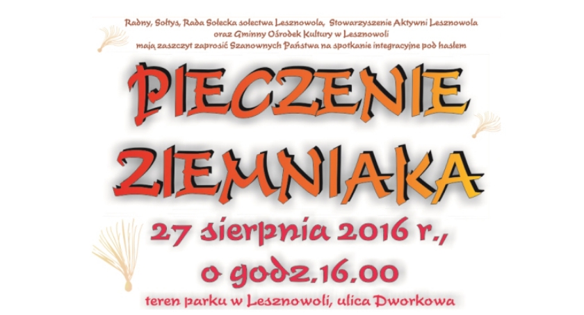 W ostatnią sobotę sierpnia - 27.08.2016 r. odbędzie się coroczny Sołecki Piknik Rodzinny pt. Pieczenie Ziemniaka w Lesznowoli. Zapraszamy na wspaniałą zabawę, liczne konkursy i biesiadę oraz tańce na dechach do późnej nocy!