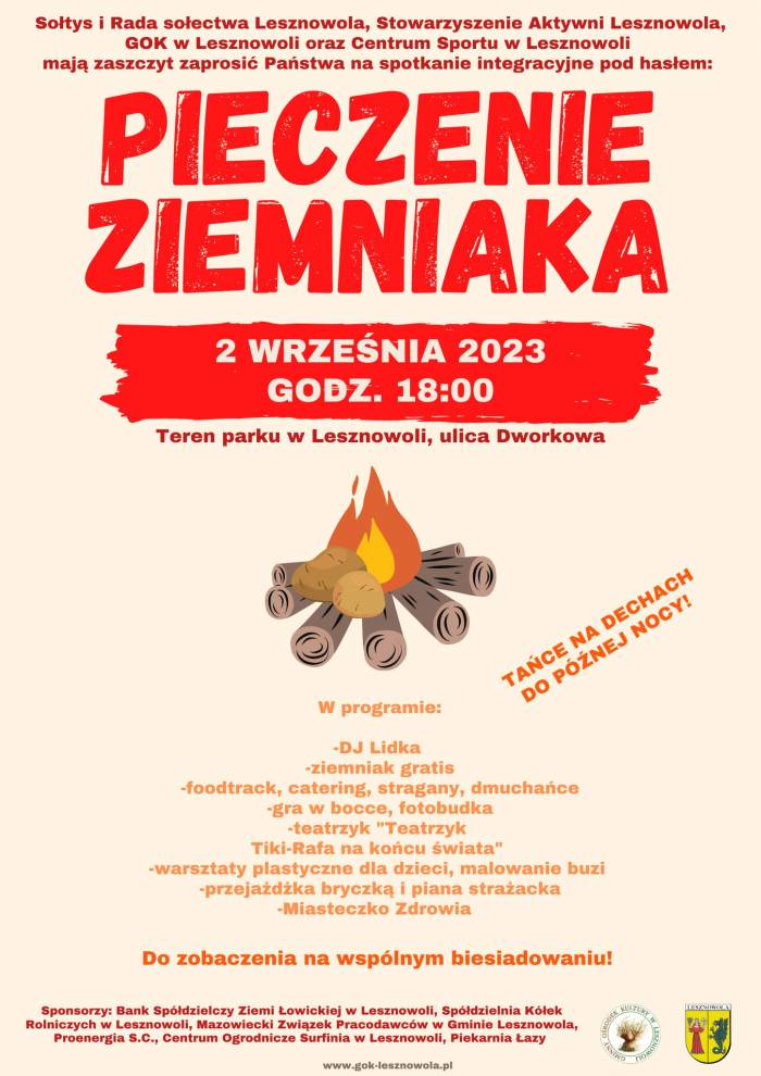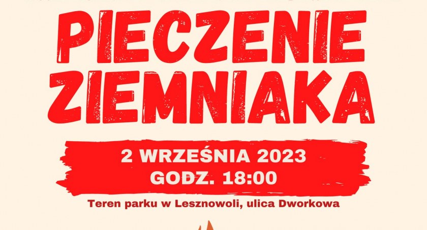 2 września 2023 roku o godzinie 18:00 na terenie parku w Lesznowoli przy ulicy Dworkowej rozpocznie się spotkanie integracyjne pod hasłem: Pieczenie Ziemniaka.