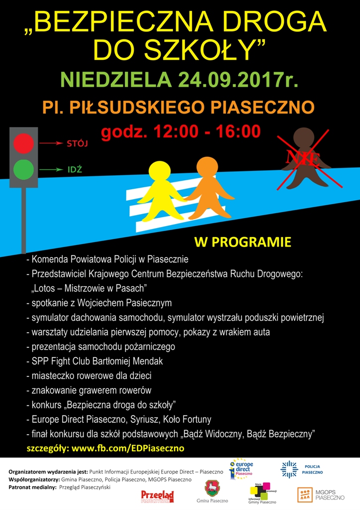 Policjanci z Komendy Powiatowej Policji w Piasecznie wraz Urzędem Miasta i Gminy Piaseczno zapraszają w dniu 24 września (niedziela) na piknik "Bezpieczna droga do szkoły". Od godziny 12.00 dla dorosłych, dzieci i młodzieży przygotowaliśmy szereg atrakcji, a wszystko w ramach profilaktyki związanej z bezpieczeństwem w ruchu drogowym i nie tylko. Serdecznie zapraszamy! Szczegóły na plakacie: