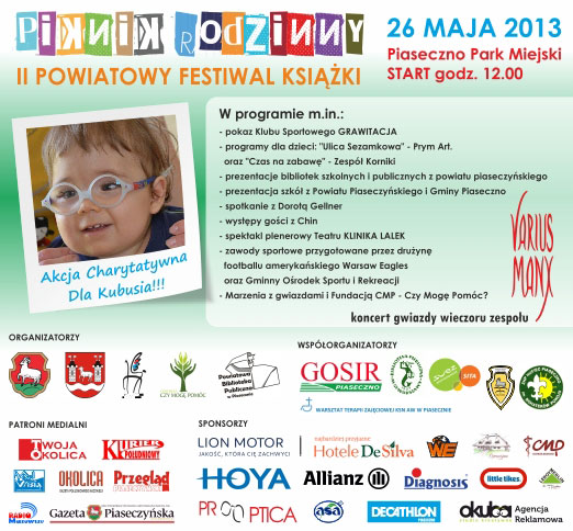 26 maja 2013 roku od godz. 12.00 zapraszamy na Piknik Rodzinny w Parku Miejskim przy Chyliczkowskiej w Piasecznie. W tym roku w ramach Pikniku Rodzinnego - Dnia Ziemi odbędzie się również II Powiatowy Festiwal Książki oraz akcja charytatywna na rzecz mieszkańca Gminy - małego Kubusia. W programie: pokaz Klubu Sportowego GRAWITACJA, spotkania z gwiazdami polskiego ekranu, prezentacje bibliotek szkolnych i publicznych z powiatu piaseczyńskiego, spotkanie z Dorotą Gellner, występy gości z Chin (z Gminy partnerskiej Huanggang), spektakl plenerowy Teatru KLINIKA LALEK, koncert zespołu VARIUS MANX i mnóstwo atrakcji dla małych i dużych przez cały dzień.