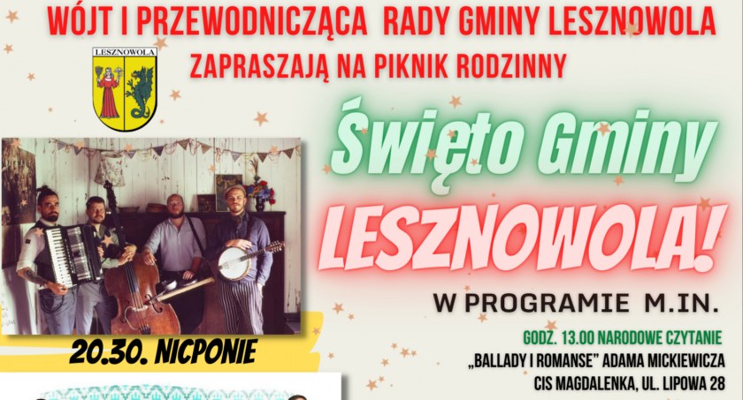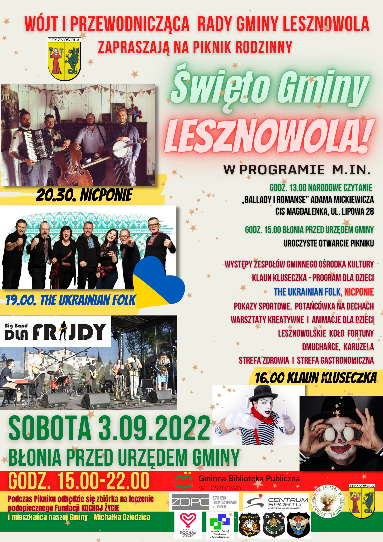 W sobotę 3 września 2022 roku Wójt i Przewodnicząca Rady Gminy Lesznowola zapraszają na RODZINY PIKNIK – Święto Gminy Lesznowola 2022. Impreza rozpocznie się o godz. 15.00 na błoniach przed urzędem gminy przy ul. Gminnej w Lesznowoli. Dodatkowo w godz. 13.00-14.30 w budynku CIS Magdalenka, ul. Lipowa 28 odbędzie się 11. edycja ogólnopolskiej akcji Narodowego Czytania, podczas której zostanie zaprezentowany utwór „Ballady i romanse” Adama Mickiewicza.