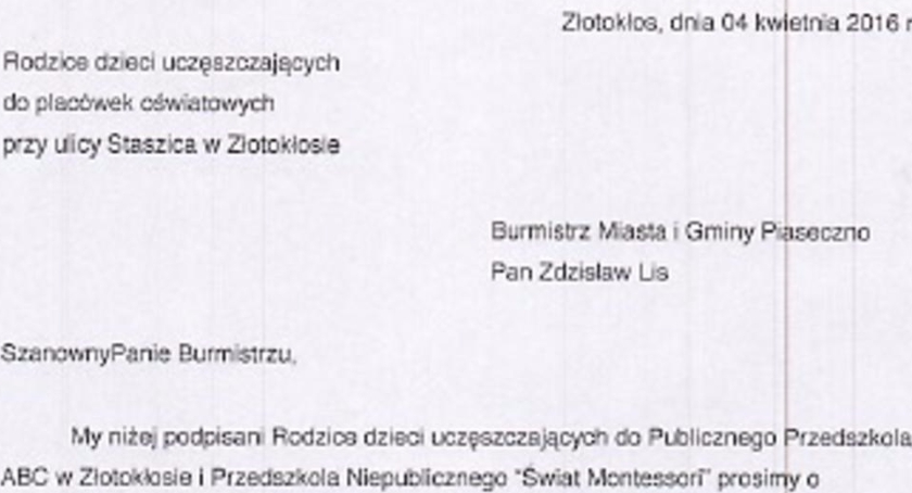 Pismo od Rodziców dzieci uczęszczających do przedszkoli w miejscowości Złotokłos o interwencję w sprawie dojazdu do placówek.