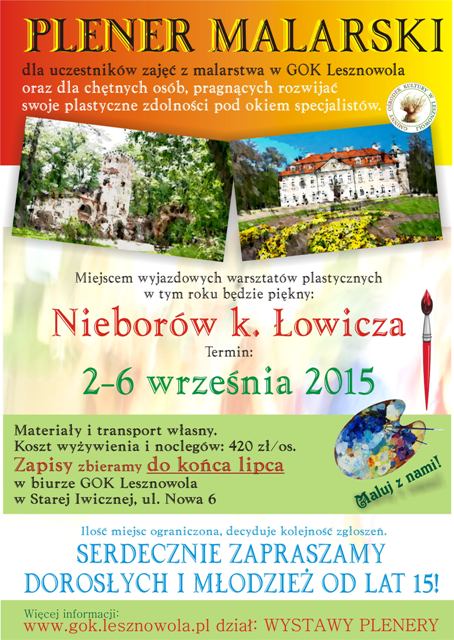 Trwają zapisy na coroczny plener artystyczny - malarsko-fotograficzny, który odbędzie się w dniach 2-6 września br. W tym roku wyruszamy do Nieborowa. Ilość miejsc ograniczona. Zapisy do końca lipca w biurze GOK w St. Iwicznej przy ul. Nowej 6. Serdecznie zapraszamy.