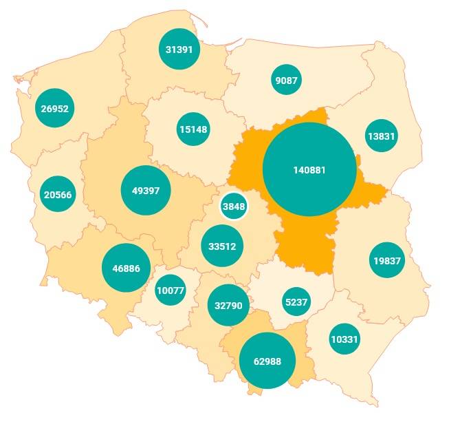 W 2021 roku liczba osób, które posiadają zezwolenie na pobyt w Polsce, wyniosła około 536 tys. Zdecydowana większość z nich przybywa nad Wisłę w poszukiwaniu pracy. Z danych Urzędu ds. Cudzoziemców[4] wynika, że najwięcej obcokrajowców posiadających ważne dokumenty uprawniające do pobytu w Polsce przebywa w województwie mazowieckim (140 tysięcy), małopolskim (prawie 63 tysiące), wielkopolskim (49 tysięcy) i dolnośląskim (prawie 47 tysięcy).