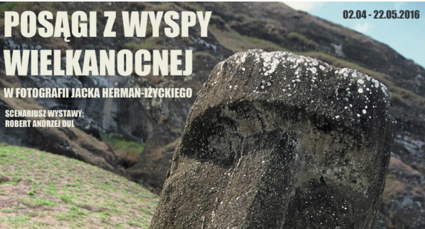 Wyspa Wielkanocna leży na Południowym Pacyfiku, oddalona o tysiące kilometrów od najbliższego zamieszkałego lądu. Szczyt kultury i możliwości twórczych jej mieszkańców przypadł na okres od X do XII stulecia. Z tego okresu pochodzi najwięcej kamiennych posągów moai, z których słynie wyspa. Te niezwykłe obiekty, ślady dawnej kultury mieszkańców, utrwalił na fotografiach podczas swojej wizyty na Wyspie Wielkanocnej podróżnik - Jacek Herman-Iżycki. Na wystawie kolorowym fotografiom przedstawiającym moai towarzyszyć będą próbki skał oraz współczesne wyroby pamiątkarskie nawiązujące stylistycznie do dawnej sztuki mieszkańców Wyspy. Scenariusz wystawy przygotował etnolog Robert Andrzej Dul.