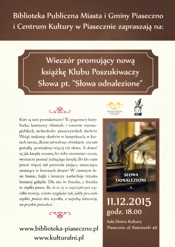 Zapraszamy na wieczór promujący nową książkę Klubu Poszukiwaczy Słowa pt. "Słowa odnalezione". Spotkanie odbędzie się w piątek 11 grudnia o godz. 18:00 w sali Domu Kultury przy ul. Kościuszki 49.