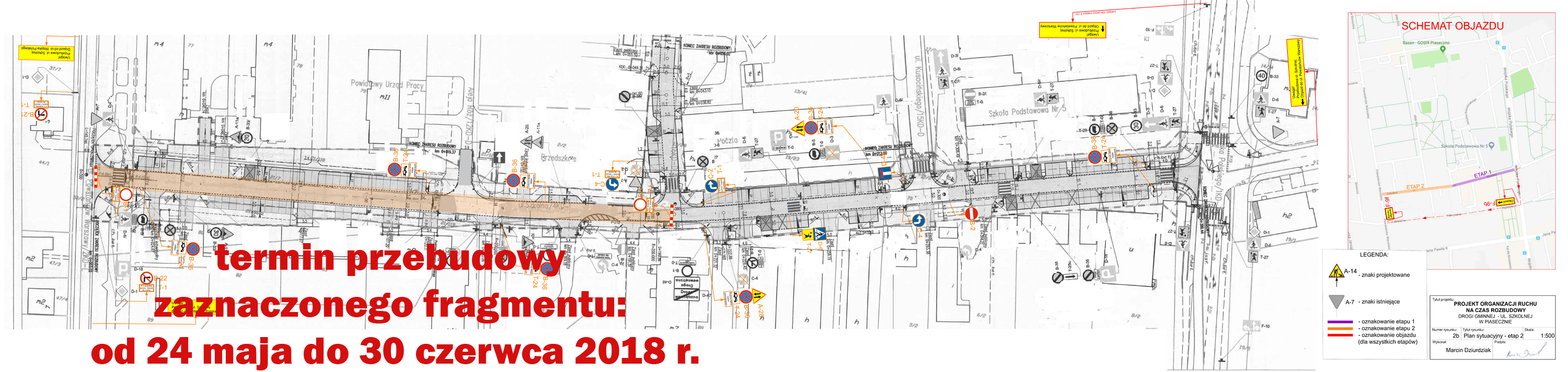 Od 24 maja 2018 roku rusza przebudowa ulicy Szkolnej w Piasecznie. Prace będą podzielone na 2 etapy. Planowane zakończenie remontu: 30 lipca. Szczegóły znajdują się na poniższych rysunkach oraz w załącznikach.
