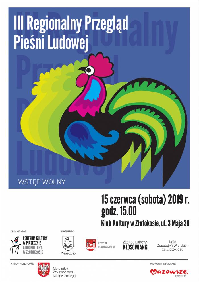 15 czerwca (sobota), godz.15:00 odbędzie się III Regionalny Przegląd Pieśni Ludowej w Złotokłosie. Miejsce: Złotokłos, ul. 3 Maja 30, Klub Kultury w Złotokłosie, budynek OSP). Wstęp wolny.