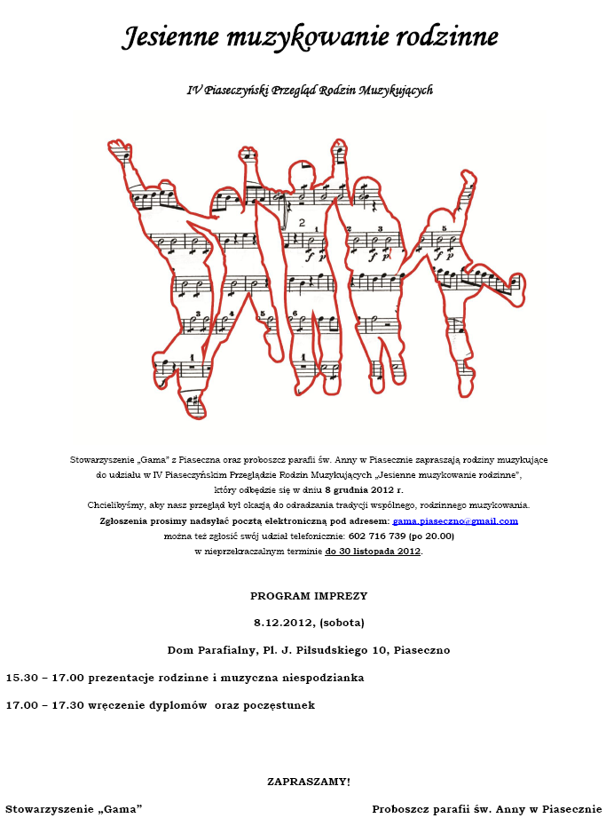 Zapraszamy na Piaseczyński Przegląd Rodzin Muzykujących Jesienne muzykowanie rodzinne, który odbędzie się 8 grudnia 2012 r. Program imprezy: 15.30 - 17.00 prezentacje rodzinne. 17.00 -17.30 wręczenie dyplomów oraz poczęstunek.