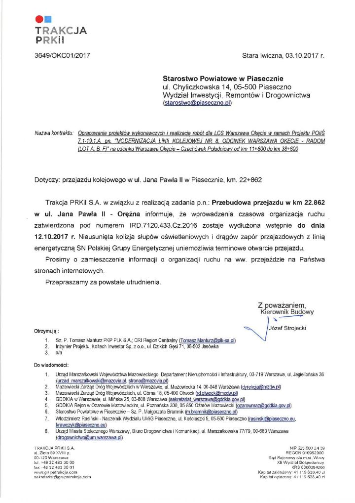 Trakcja PRKiI SA przesuwa termin otwarcia przejazdu kolejowego na Orężnej w Piasecznie na 12 października i ponownie tłumaczy opóźnienie "nieusuniętą kolizją słupów oświetleniowych i drągów zapór przejazdowych".
