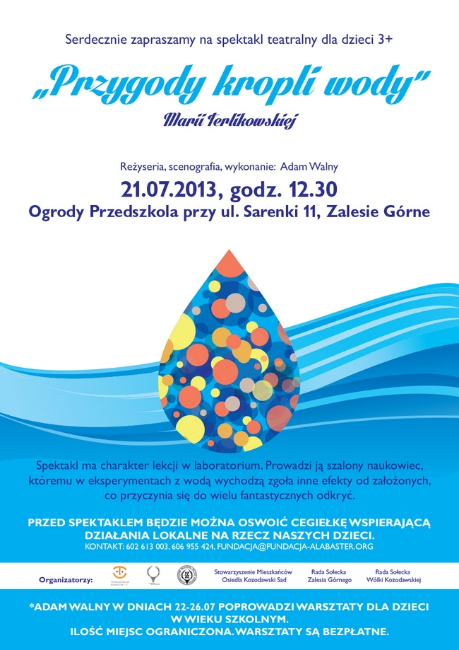 21 lipca 2013 roku o godzinie 12:30 zapraszamy na "Przygody Kropli Wody" - spektakl Adama Walnego, zrealizowany w technice teatru przedmiotu, przeznaczony dla dzieci 3+. Spektakl będzie miał miejsce w ogrodach Przedszkola przy ul. Sarenki 11 w Zalesiu Górnym.