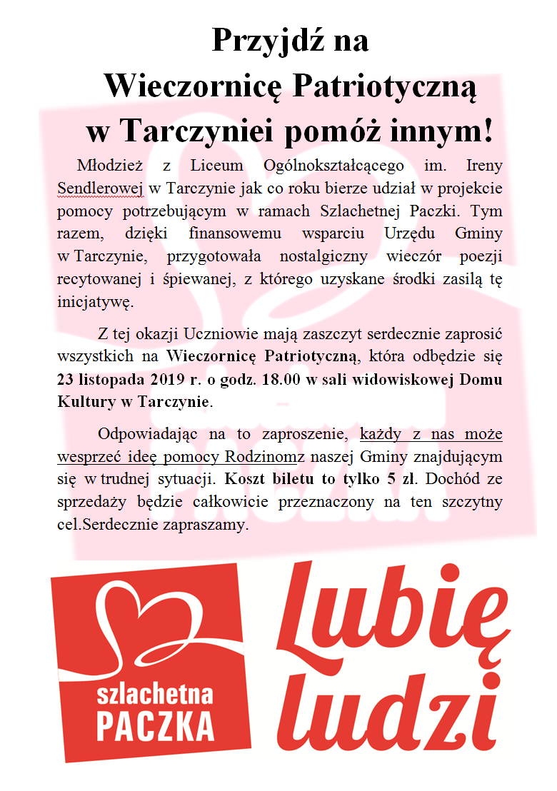 Młodzież z Liceum Ogólnokształcącego im. Ireny Sendlerowej w Tarczynie jak co roku bierze udział w projekcie pomocy potrzebującym w ramach Szlachetnej Paczki. Tym razem, dzięki finansowemu wsparciu Urzędu Gminy w Tarczynie, przygotowała nostalgiczny wieczór poezji recytowanej i śpiewanej, z którego uzyskane środki zasilą tę inicjatywę.