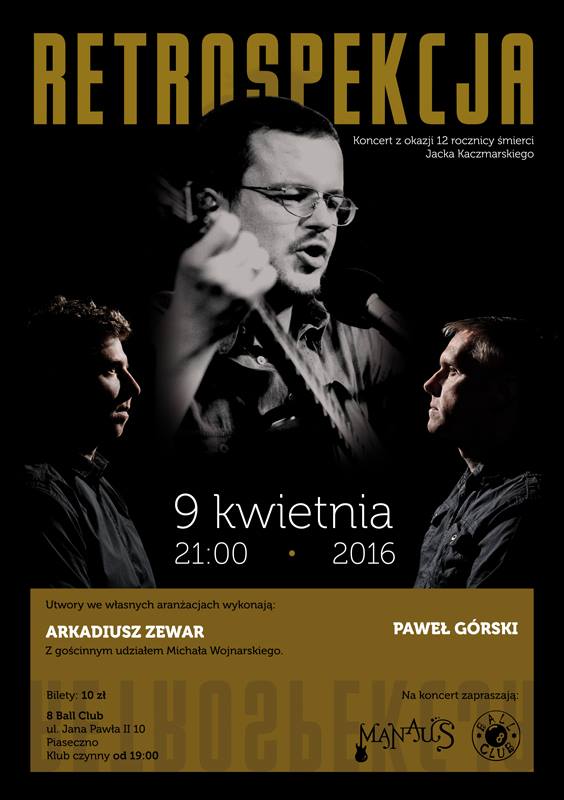 Zapraszamy 9 kwietnia 2016 roku o godz. 21.00 na nową odsłonę piosenek Jacka Kaczmarskiego. Utwory Jacka Kaczmarskiego, we własnych aranżacjach wykonają dwie osobowości piaseczyńskiej sceny muzycznej: Arek Zewar i Paweł Górski. Gościnnie wystąpi Michał Wojnarski. Miejsce: 8 Ball Club Jana Pawła II 10 Piaseczno. Wstęp 10 zł.