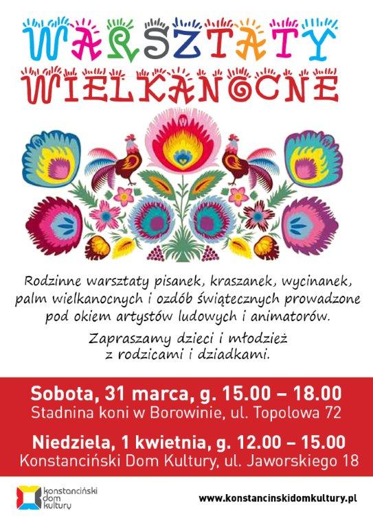 31 marca i 1 kwietnia 2012 roku zapraszamy na Rodzinne Warsztaty Wielkanocne w gminie Konstancin-Jeziorna. Wstęp wolny. Zapraszamy wszystkich mieszkańców z dziećmi. Sobota, 31 marca, g. 15.00 - 18.00, Stadnina koni w Borowinie, ul. Topolowa 72. Niedziela, 1 kwietnia, g. 12.00 - 15.00, Konstanciński Dom Kultury, ul. Jaworskiego 18