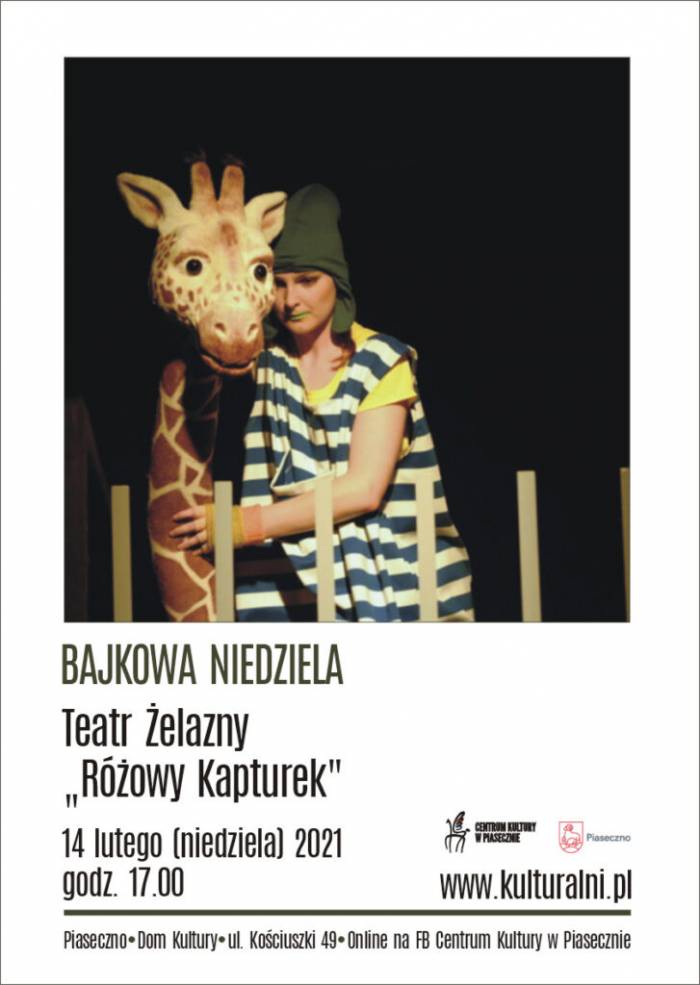 BAJKOWA NIEDZIELA Teatr Żelazny - „Różowy Kapturek” 14 lutego (niedziela) godz. 17.00 Dom Kultury, ul. Kościuszki 49, Piaseczno. Transmisja - FB Centrum Kultury.