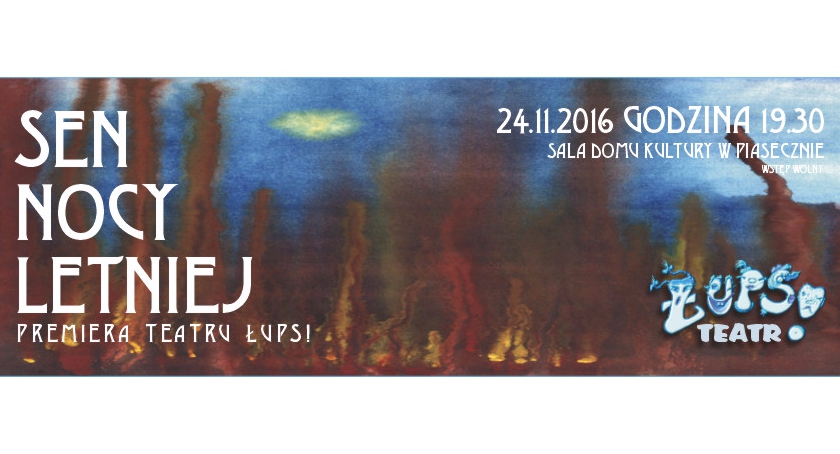 24 listopada 2016 roku o godz. 19:30 zapraszamy na premierę spektaklu Sen Nocy Letniej, w wykonaniu aktorów Teatru Łups! Miejsce: Domu Kultury ul. Kościuszki 49, Piaseczno. Wstęp wolny.