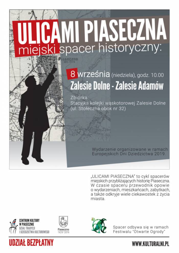 8 września (niedziela), godz. 10:00 ULICAMI PIASECZNA. MIEJSKI SPACER HISTORYCZNY – Zalesie Dolne – Zalesie Adamów. Historie związane z odwiedzanymi ulicami opowiadać będzie Stanisław Hofman – znany piaseczyński przewodnik, miłośnik i popularyzator historii Piaseczna.