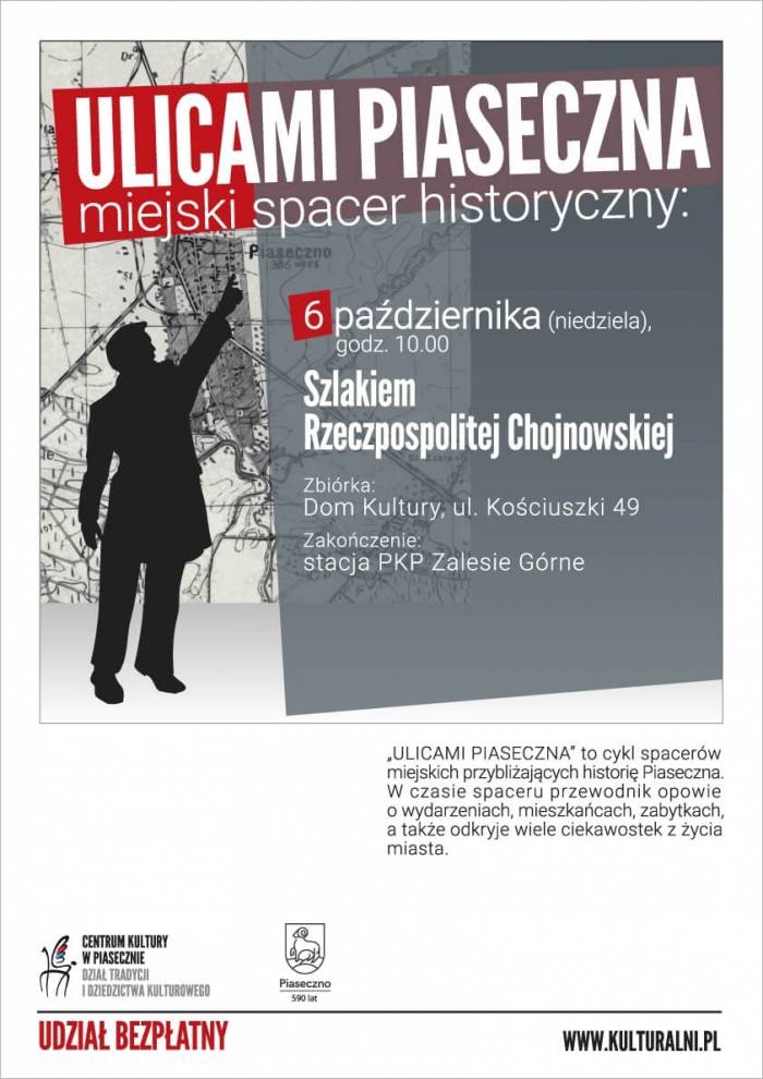 6 października (niedziela), godz. 10:00 odbędzie się spacer z przewodnikiem z cyklu: ULICAMI PIASECZNA: MIEJSKI SPACER HISTORYCZNY. Temat: Szlakiem Rzeczpospolitej Chojnowskiej.