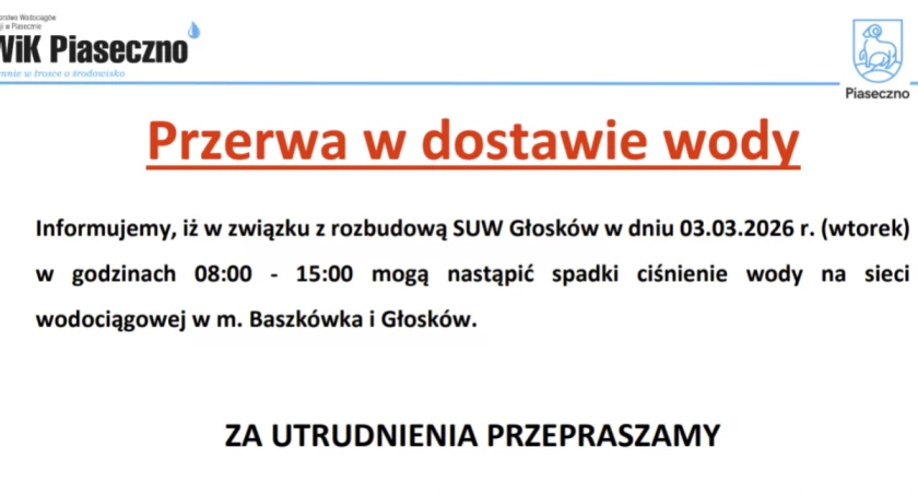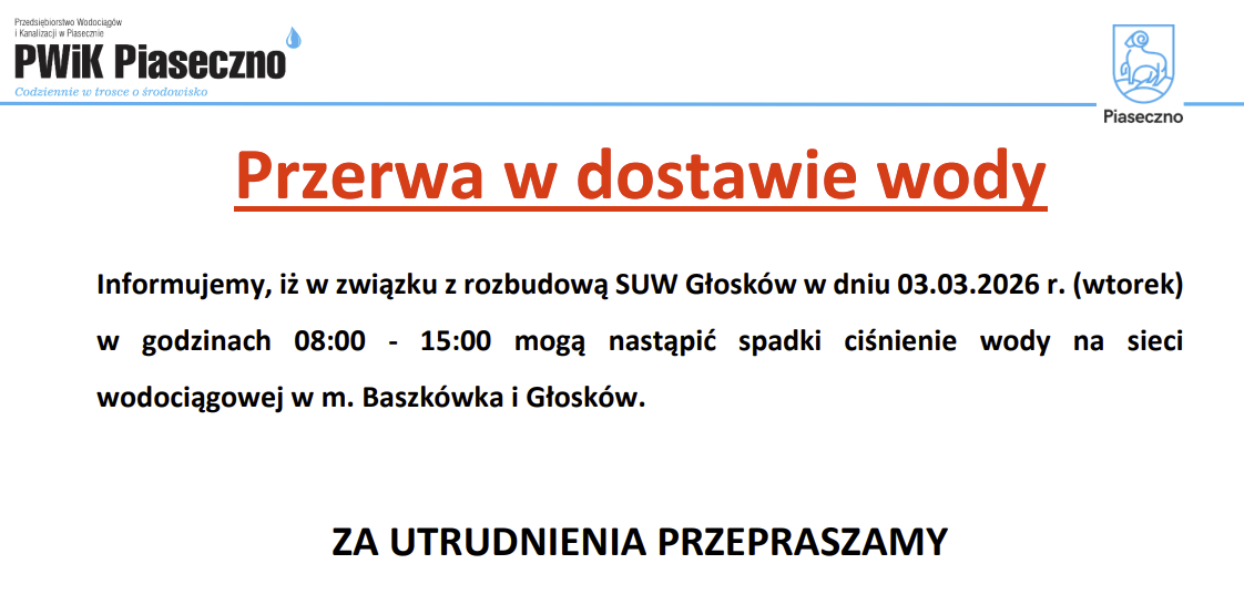 PWiK Piaseczno informuje, iż w związku z rozbudową SUW Głosków w dniu 03.03.2026 r. (wtorek) w godzinach 08:00 - 15:00 mogą nastąpić spadki ciśnienie wody na sieci wodociągowej w m. Baszkówka i Głosków.