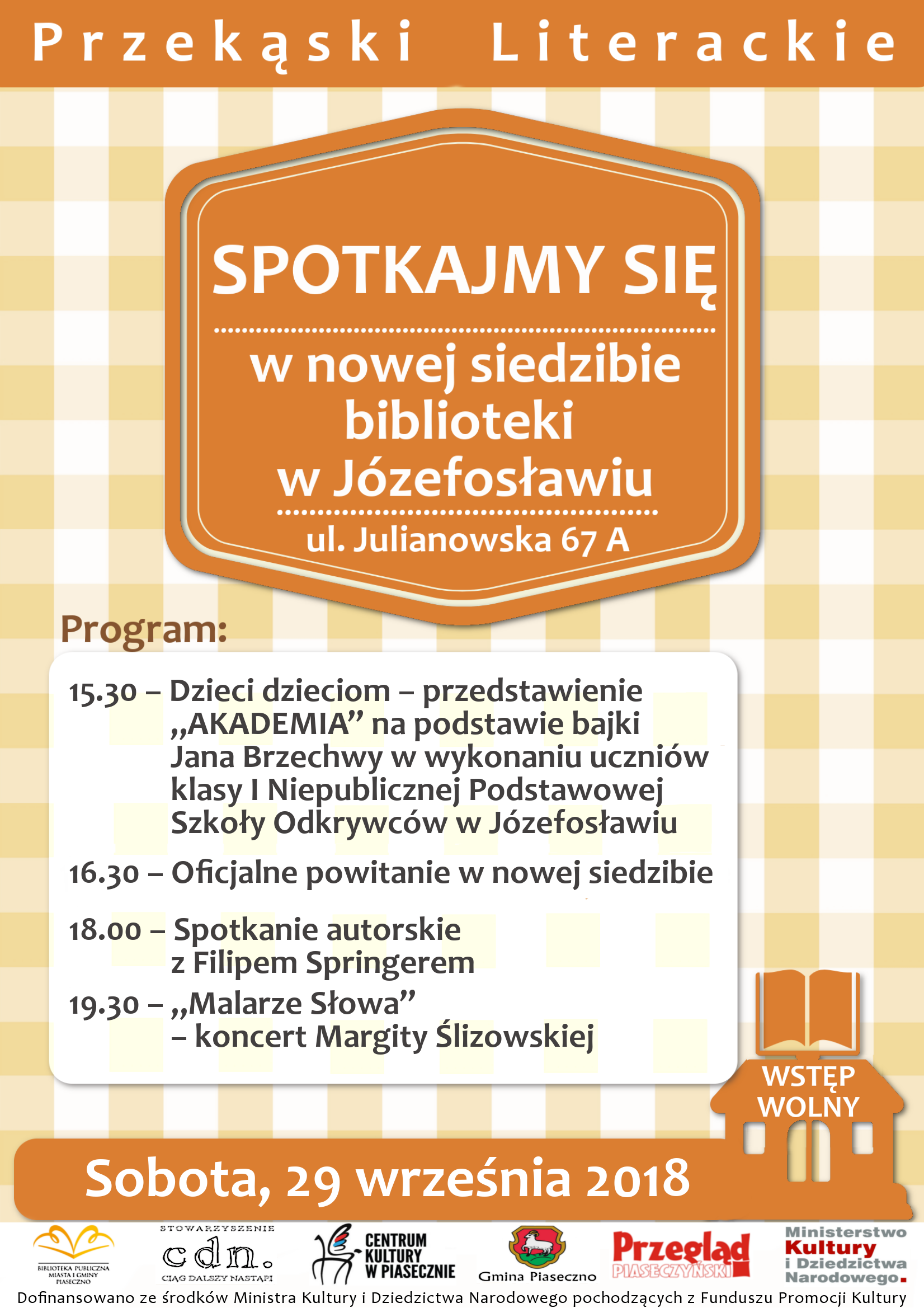 Projekt ,,Przekąski literackie” realizowany jest przez Bibliotekę Publiczną Miasta i Gminy Piaseczno oraz Stowarzyszenie „Ciąg Dalszy Nastąpi” we współpracy z Centrum Kultury w Piasecznie oraz dofinansowany ze środków Ministra Kultury i Dziedzictwa Narodowego pochodzących z Funduszu Promocji Kultury.