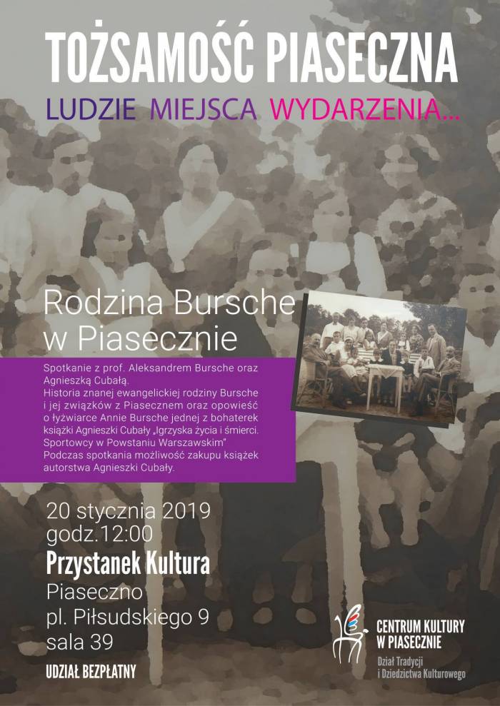 Historia znanej ewangelickiej rodziny Bursche i jej związków z Piasecznem oraz opowieść o łyżwiarce Annie Bursche – jednej z bohaterek książki Agnieszki Cubały „Igrzyska życia i śmierci. Sportowcy w Powstaniu Warszawskim”. Podczas spotkania możliwość zakupu książek autorstwa Agnieszki Cubały. Miejsce: Przystanek Kultura, pl. Piłsudskiego 9 w Piasecznie, sala 39. Wstęp wolny.