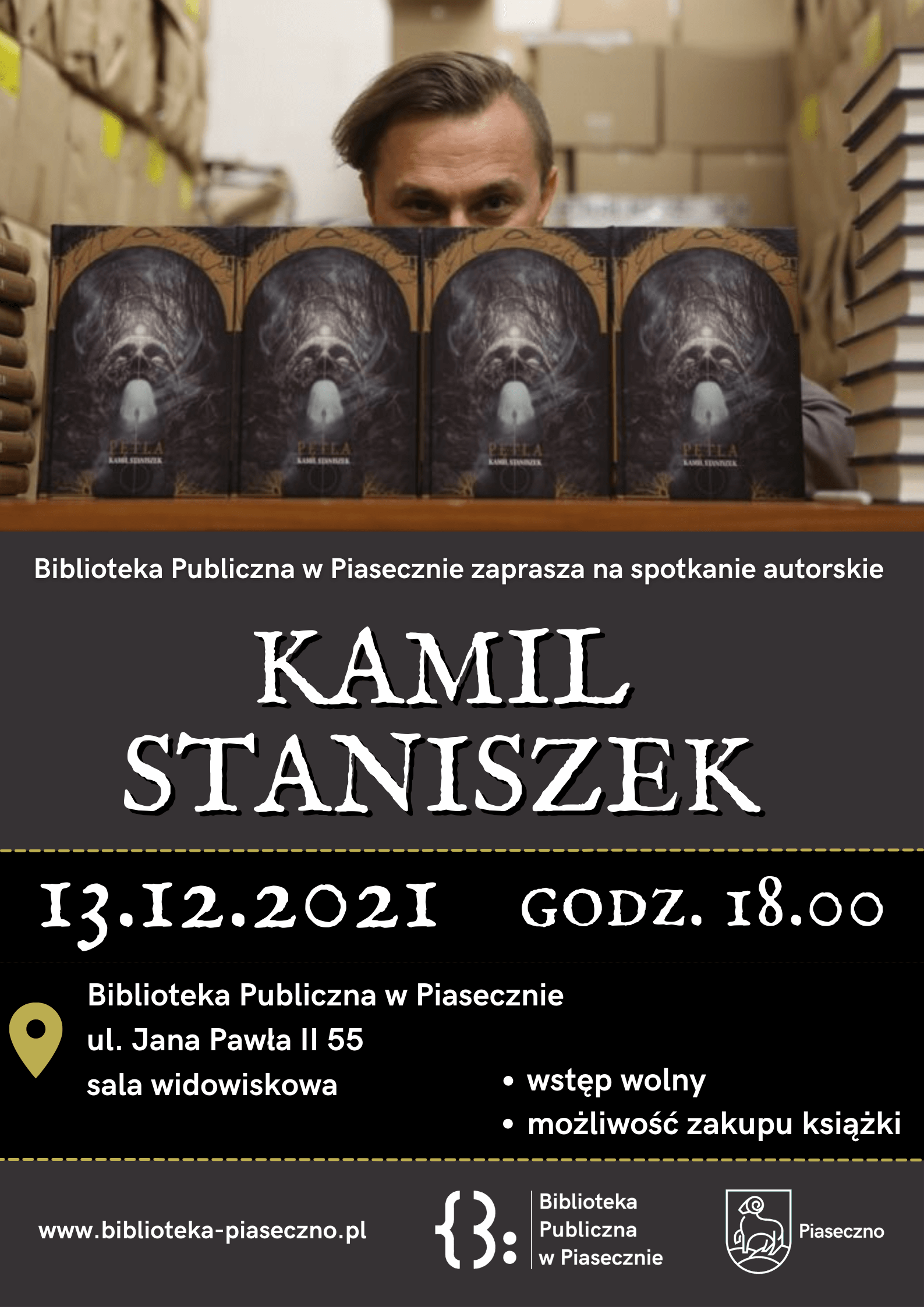 Biblioteka Publiczna w Piasecznie zaprasza na spotkanie z Kamilem Staniszkiem, autorem książki “Pętla” 13 grudnia 2021 roku (poniedziałek) o godz. 18.00. Wstęp jest wolny. Przed spotkaniem będzie można kupić książkę autora.
