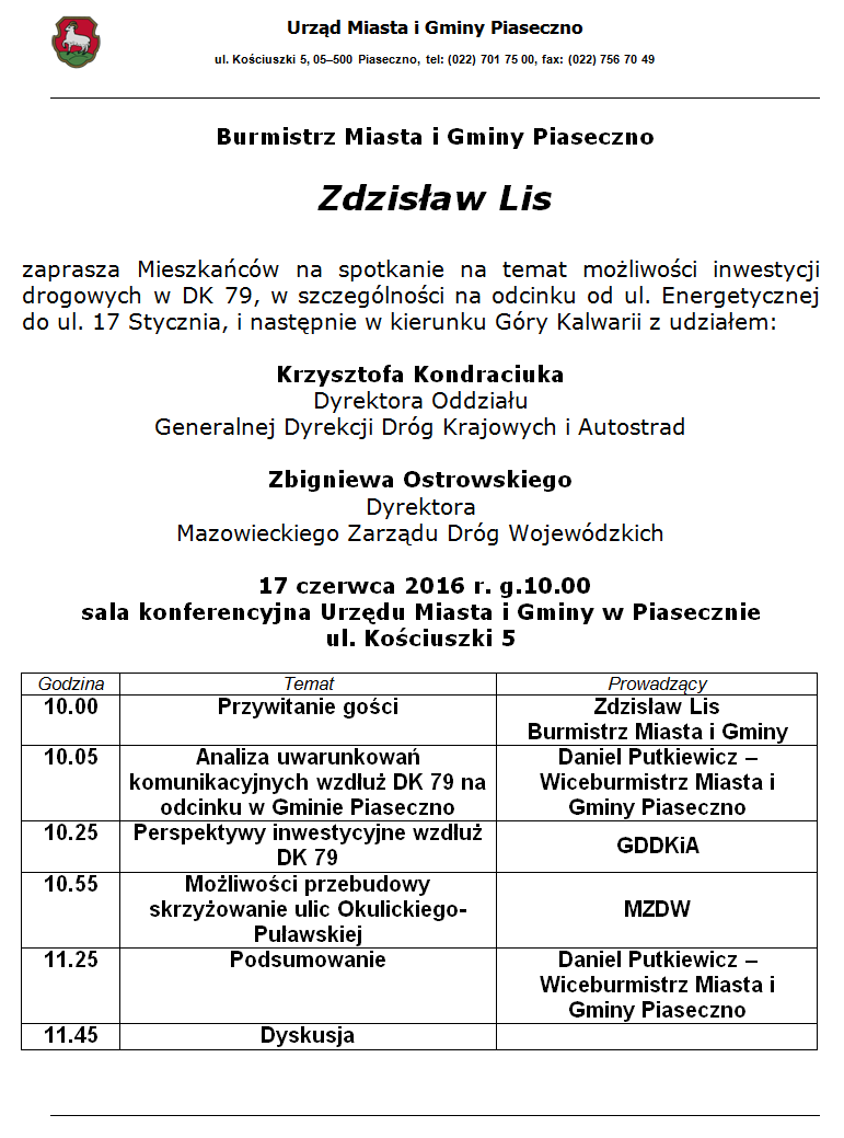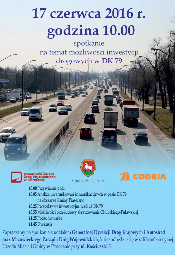 Burmistrz Miasta i Gminy Piaseczno zaprasza Mieszkańców na spotkanie na temat możliwości inwestycji drogowych w DK 79, w szczególności na odcinku od ul. Energetycznej do ul. 17 Stycznia, i następnie w kierunku Góry Kalwarii. Termin: 17 czerwca 2016 r. g.10.00 Miejsce: sala konferencyjna Urzędu Miasta i Gminy w Piasecznie ul. Kościuszki 5.