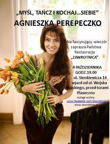 4 października 2013 roku o godz. 19:00 w restauracji Zawrotnica w Piasecznie odbędzie się specjalne spotkanie KKK z panią Agnieszką Perepeczko. Pani Agnieszka będzie promować swoją najnowszą książkę Myśl, tańcz i kochaj siebie .