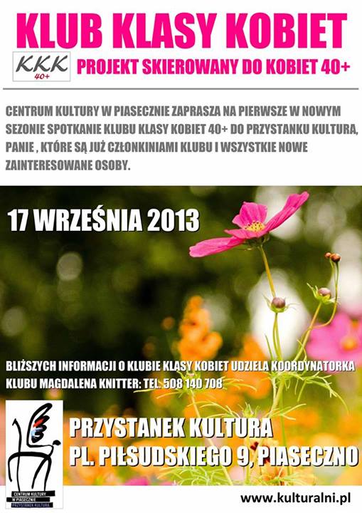 Klub Klasy Kobiet 40+ rozpoczyna spotkania w nowym sezonie. Pierwsze, powakacyjne spotkanie 17 września 2013 roku o godz. 18.00 w Przystanku Kultura. Zapraszamy!