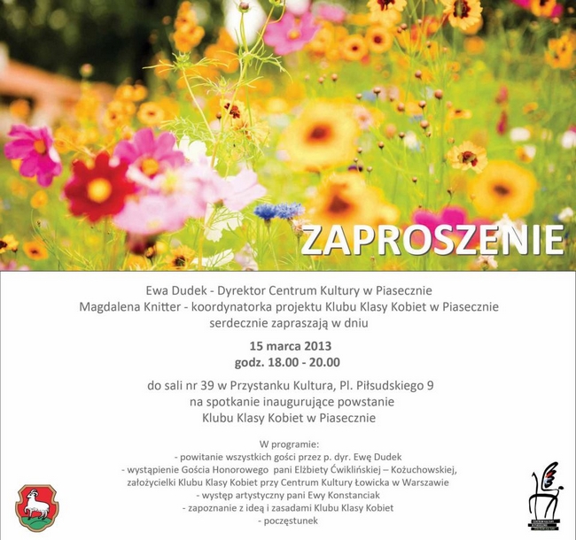 15 marca 2013 roku zapraszamy na inaugurację Klubu Klasy Kobiet w Piasecznie, nowego projektu skierowanego do kobiet 40+. Klub Klasy Kobiet będzie miejscem spotkań, rozwoju i integracji. Podczas inauguracji zapoznamy z ideą i zasadami działalności klubu. Miejsce: Przystanek Kultura, Plac Piłsudskiego 9 w Piasecznie. Zapraszamy o godz. 18.00