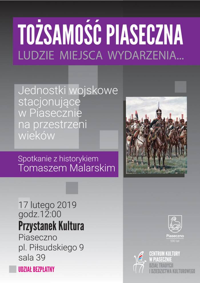 17 lutego, godz. 12.00 TOŻSAMOŚĆ PIASECZNA. LUDZIE, MIEJSCA, WYDARZENIA Cykl spotkań popularyzujących wiedzę na temat lokalnego dziedzictwa. Tomasz Malarski - „Jednostki wojskowe stacjonujące w Piasecznie na przestrzeni wieków” Miejsce: Piaseczno, pl. Piłsudskiego 9 (Przystanek Kultura). Wstęp wolny.