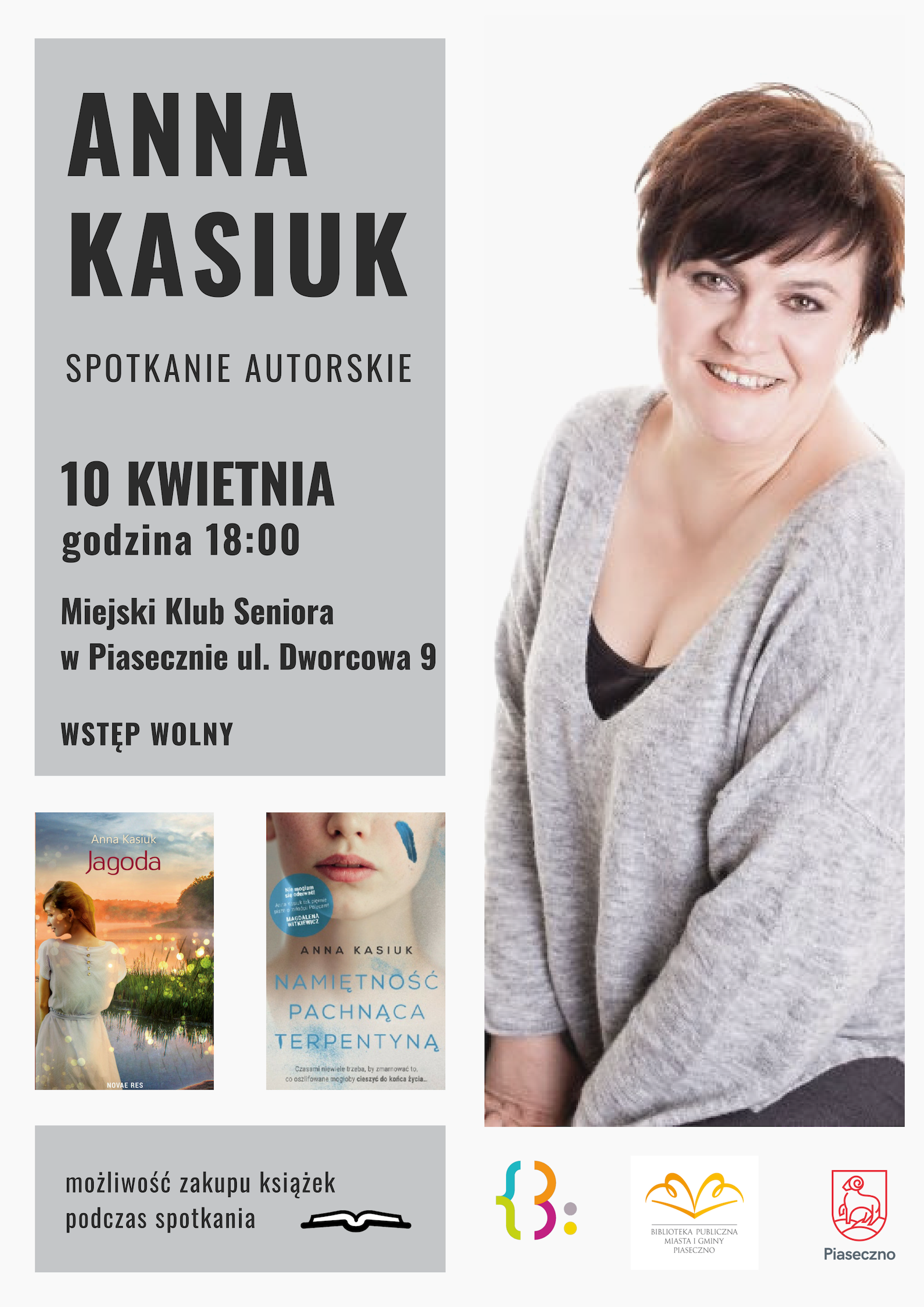 Zapraszamy na spotkanie z Anną Kasiuk, autorką takich książek jak: „Andromeda”, „Kwiaciarka”. Podczas spotkania autorka opowie o swojej pracy pisarskiej, inspiracjach i pomysłach na książki.