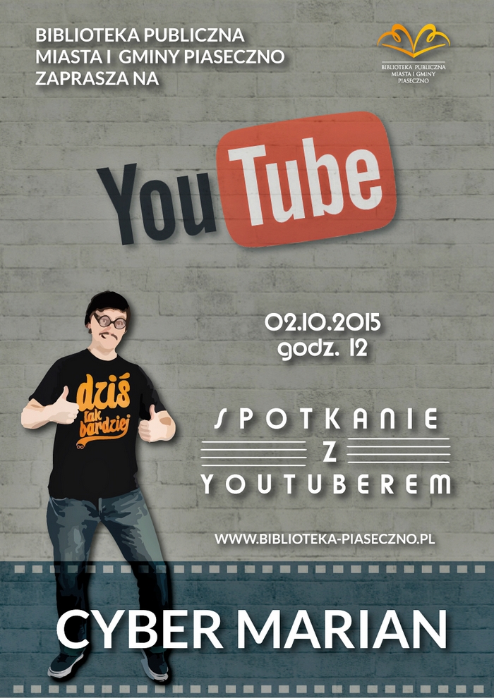 2 października 2015 roku, Biblioteka Publiczna Miasta i Gminy Piaseczno zaprasza na spotkanie ze słynnym youtuberem - Cyber Marianem. Spotkanie odbędzie się o godzinie 12:00 w budynku Biblioteki przy ulicy Kościuszki 49. Spotkanie będzie miało na celu wprowadzenie uczestników w tajniki pracy youtuberów.